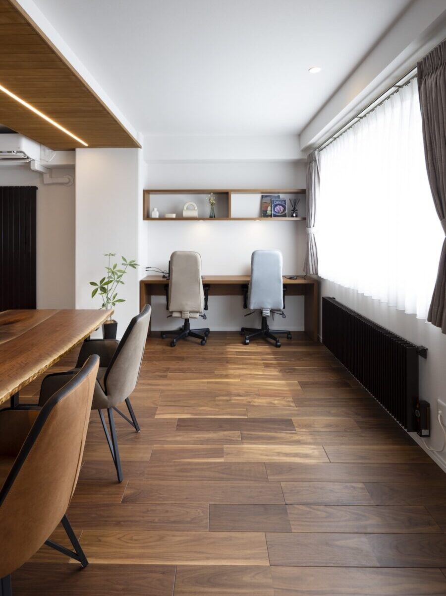 木の温もりを感じるインテリアがお好きなK様ご夫婦。既存のダークブラウンの建具や、洗面室の木枠ミラーはあえて残し、それに合わせるように床材や壁材、造作家具を選んでいきました。