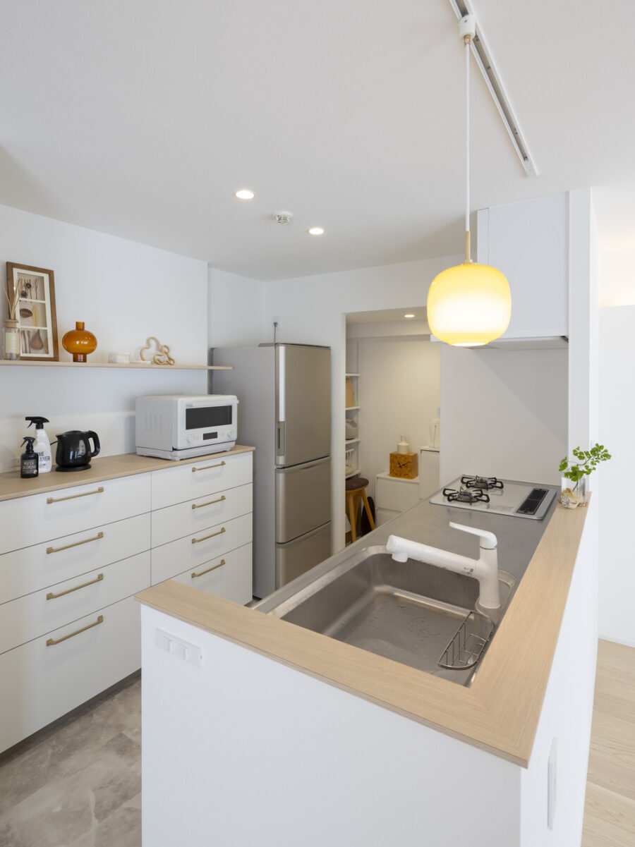 キッチン前に下がるペンダントライトは、インテリア全体との調和を意識して選びました。