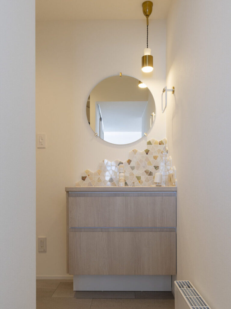丸いミラーや真鍮のペンダントライトを合わせ、素材や色のバランスを何度も検討。