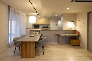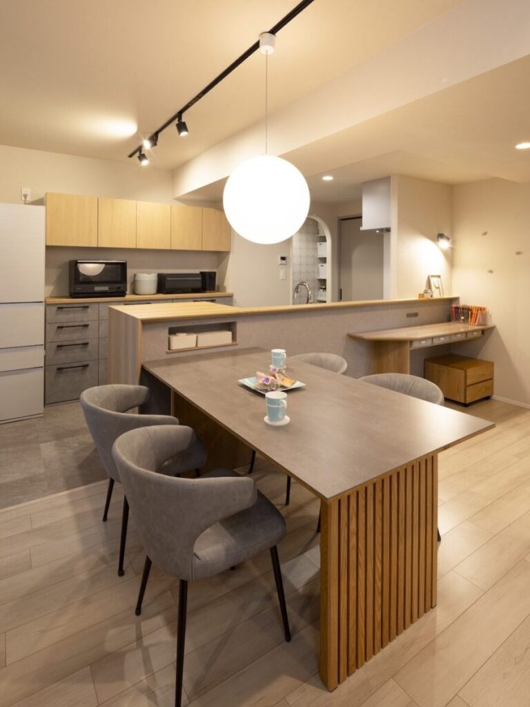 造作のキッチンカウンターと背面のカップボードは、グレーのトーンでまとめて落ち着きのある統一感を演出。リビングからのつながりを意識しつつ、空間ごとの個性も活かせるよう、照明計画は全体のインテリアと自然に溶け込むようご提案しました。機能性と美しさ、そしてご家族の暮らしやすさが共存する、こだわりのダイニングキッチンです。
