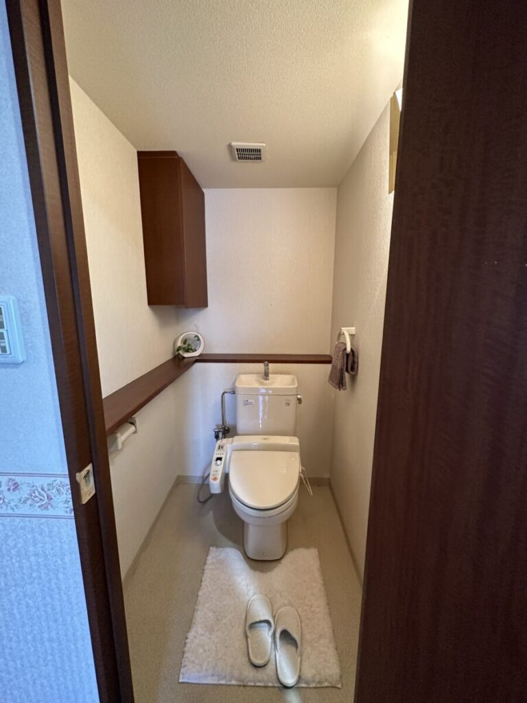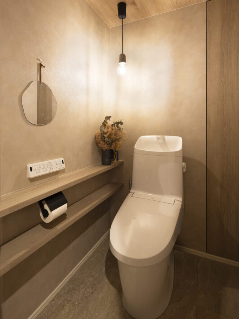 生活感を抑えつつ快適に過ごせるよう、スッキリとした収納付きカウンターを設置したトイレ。カラーは空間全体をグレージュでまとめ、落ち着きの中に上品さと洗練が漂う印象に。