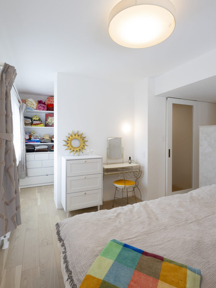 ベッドスペースは腰壁でゆるやかに仕切り、ひとり暮らしにちょうどよいワンルームのような空間構成としました。腰壁の奥にはクローゼットを配置し、ベッドから収納、身支度までが自然につながる動線に。